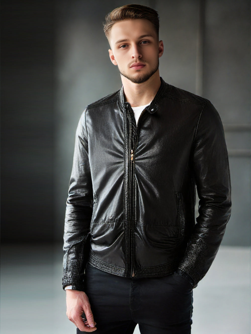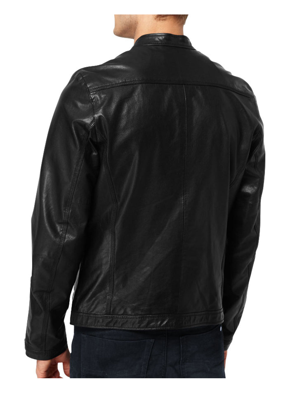 Moto-Jacke aus echtem Leder mit rundem Kragen für Herren
