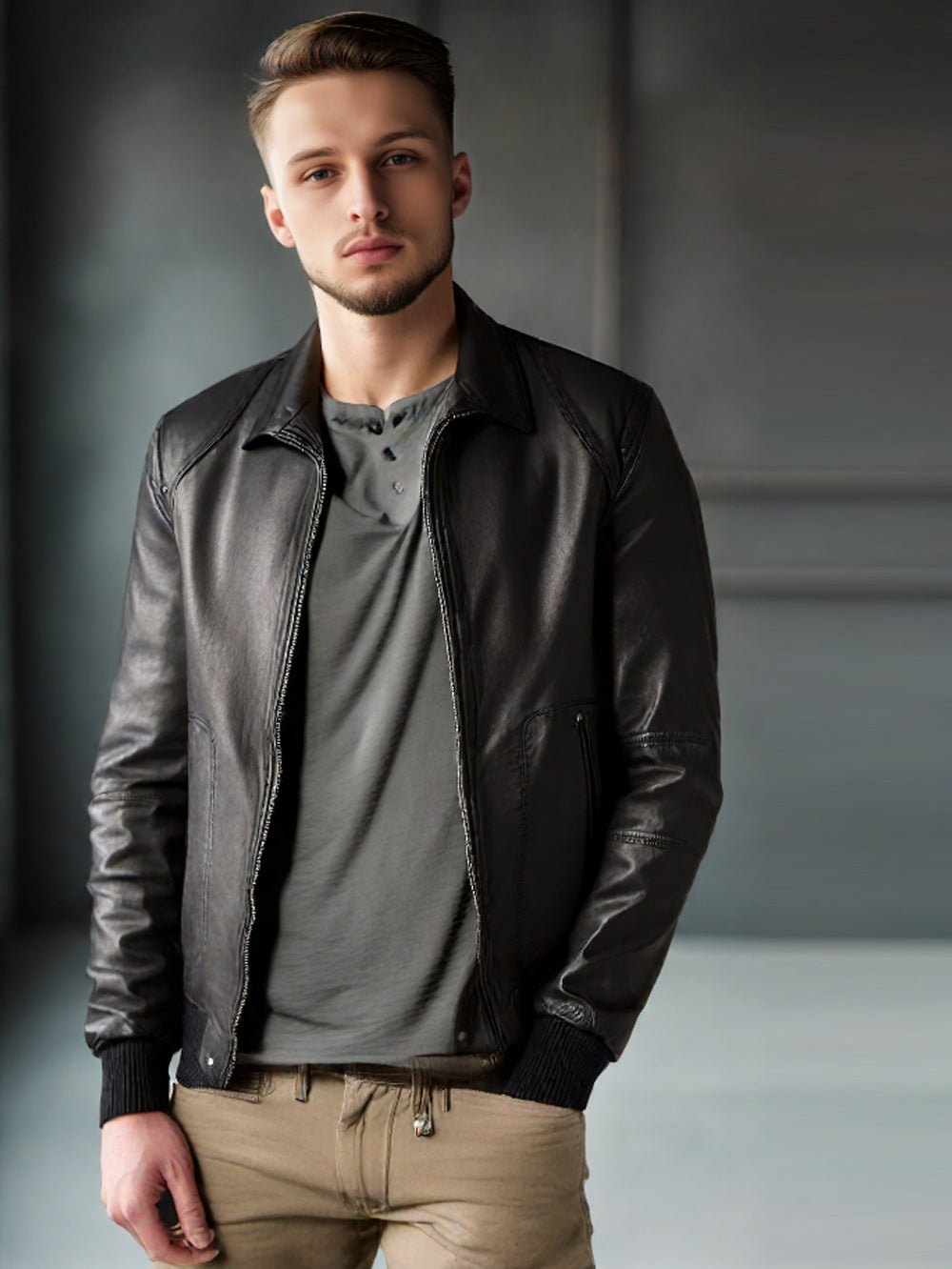 Edle Bomberjacke aus Leder mit geripptem Besatz für Herren