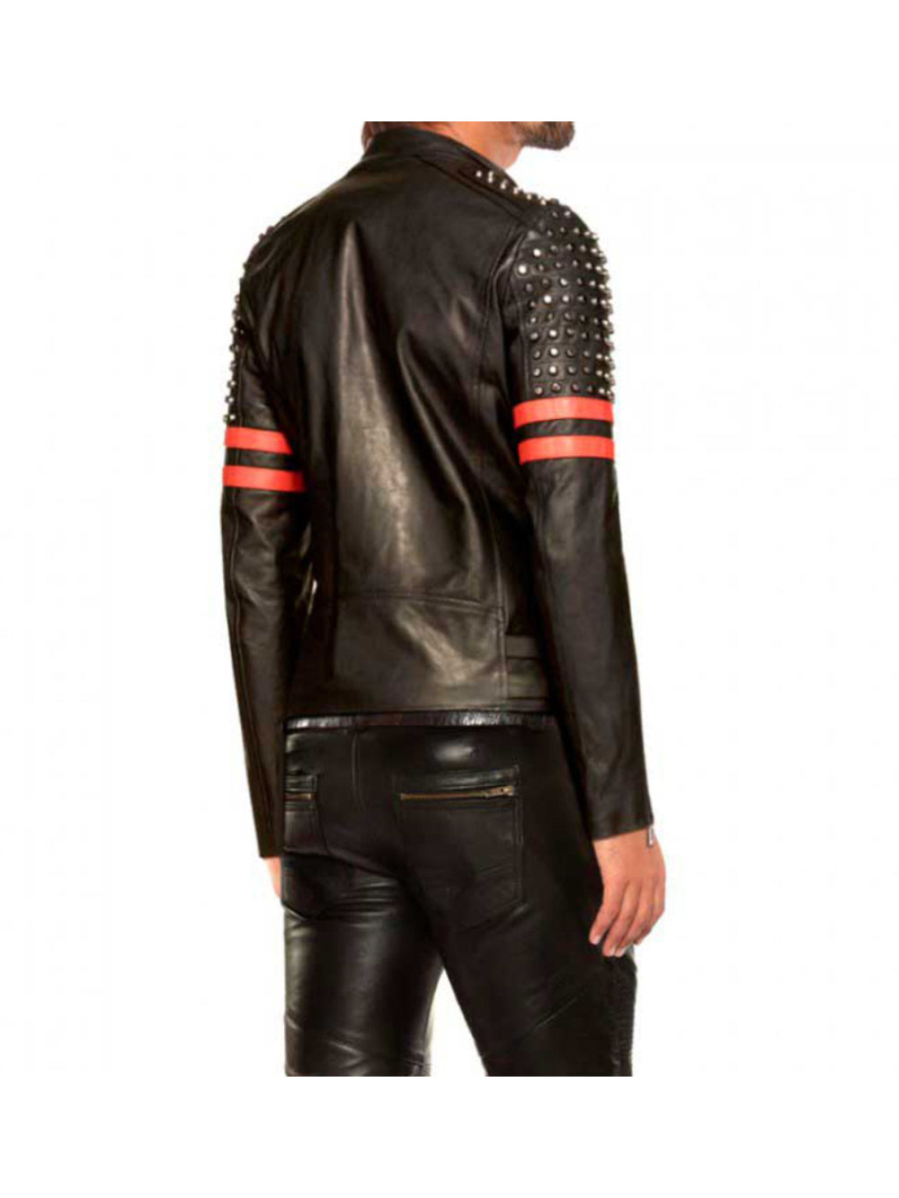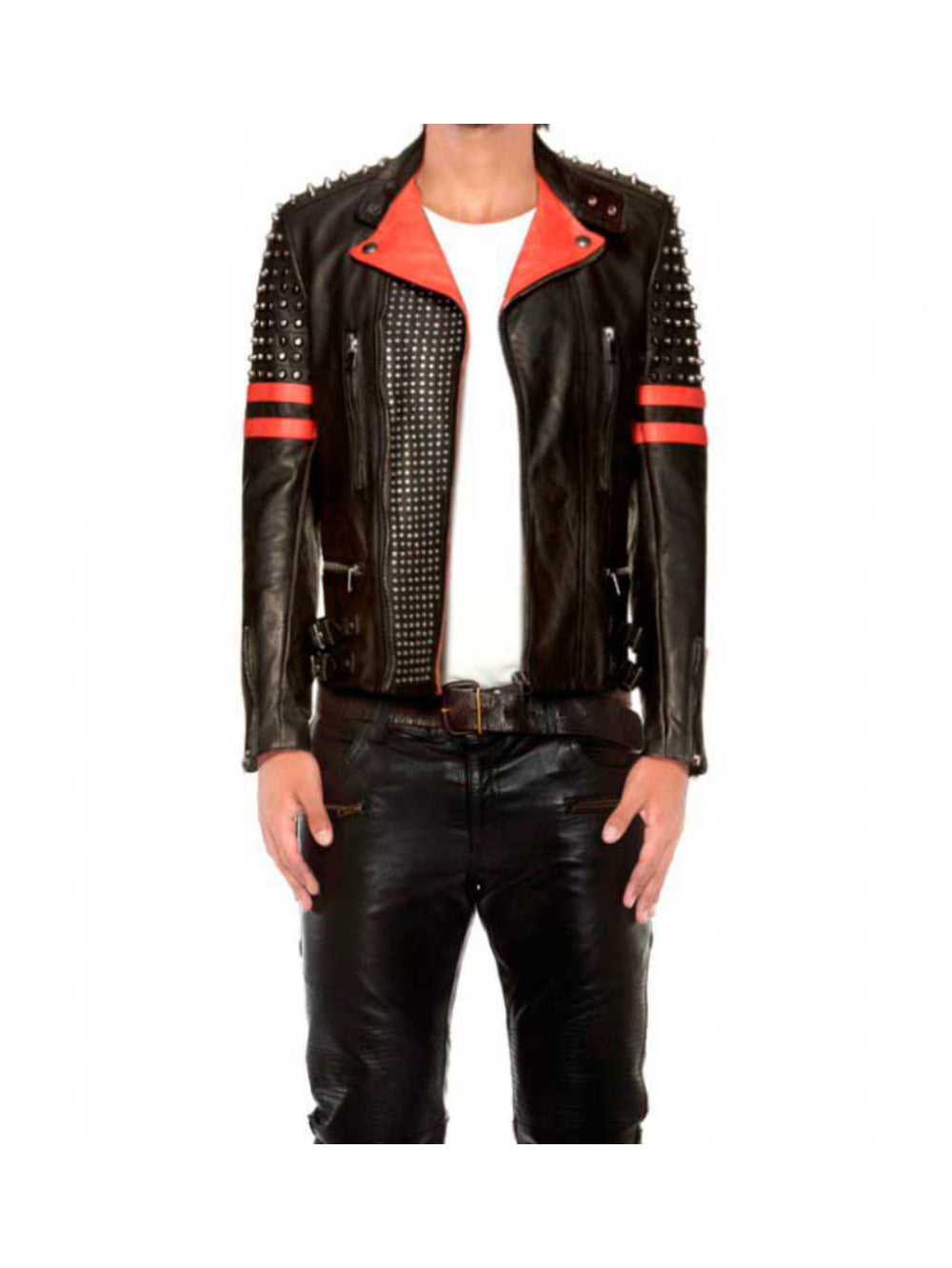 Veste de motard en cuir véritable clouté noir et rouge pour homme