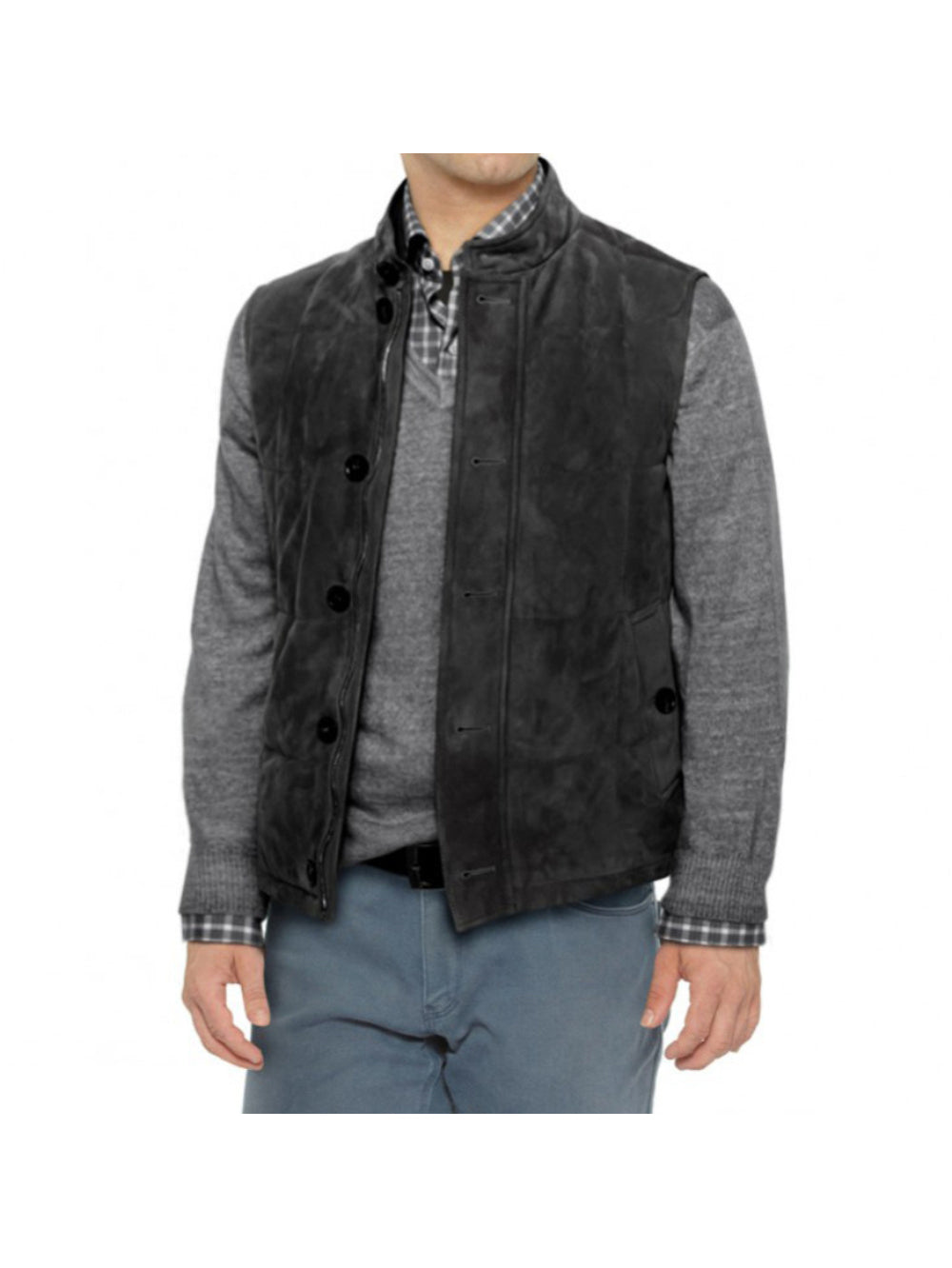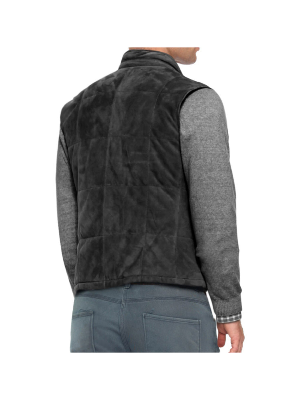 Gilet matelassé en daim gris avec col montant et cuir véritable pour homme