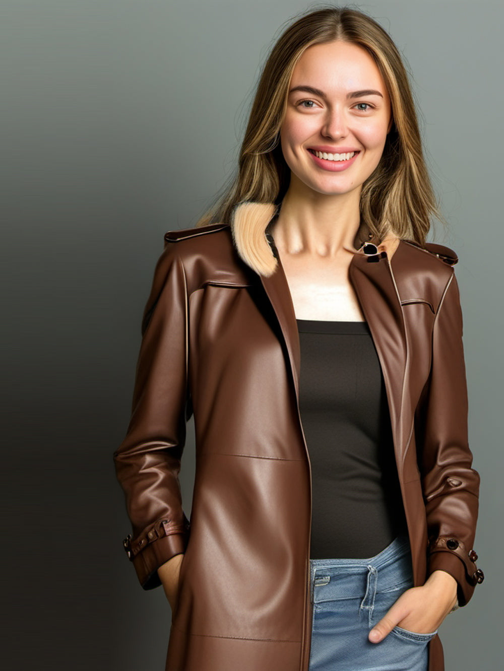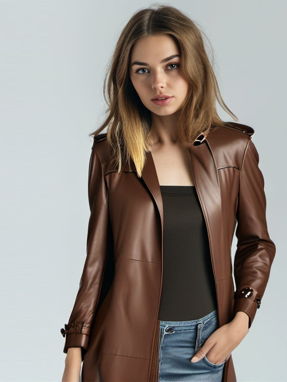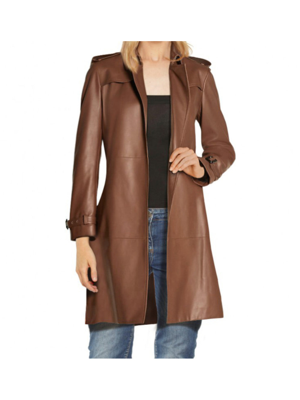 Trench-coat minimaliste en cuir marron pour femme
