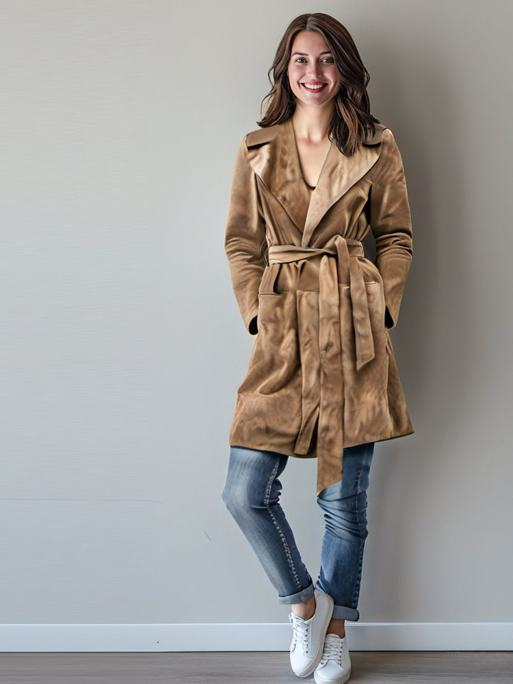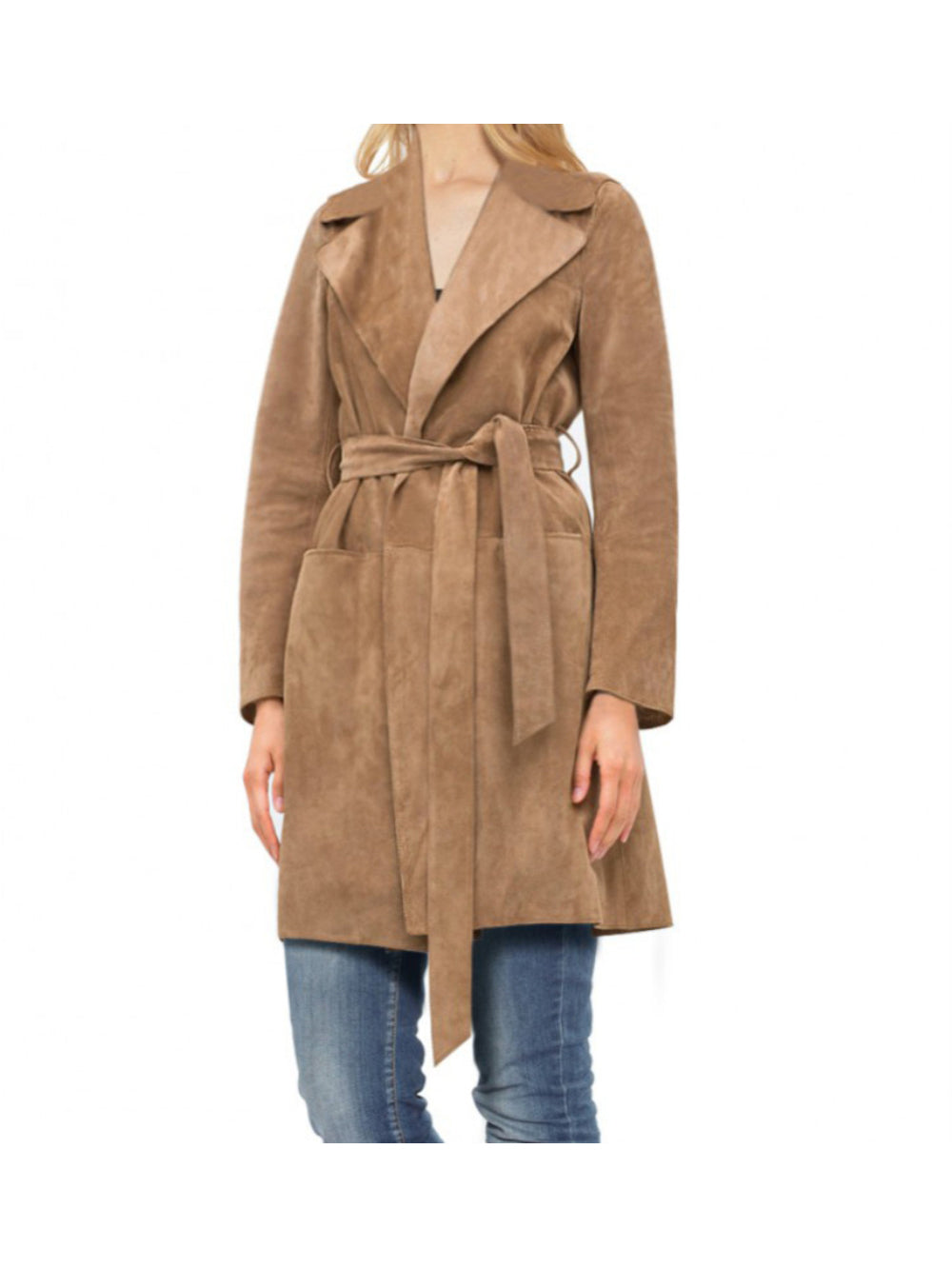 Trench-coat en cuir camel avec ceinture pour femme