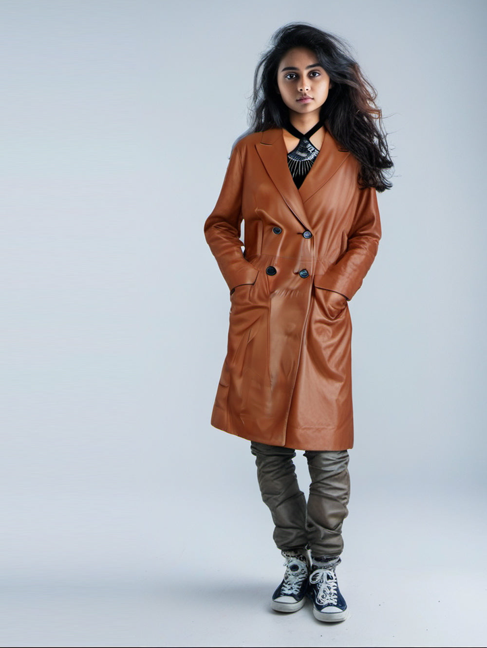 Manteau en cuir croisé extensible de luxe pour femme