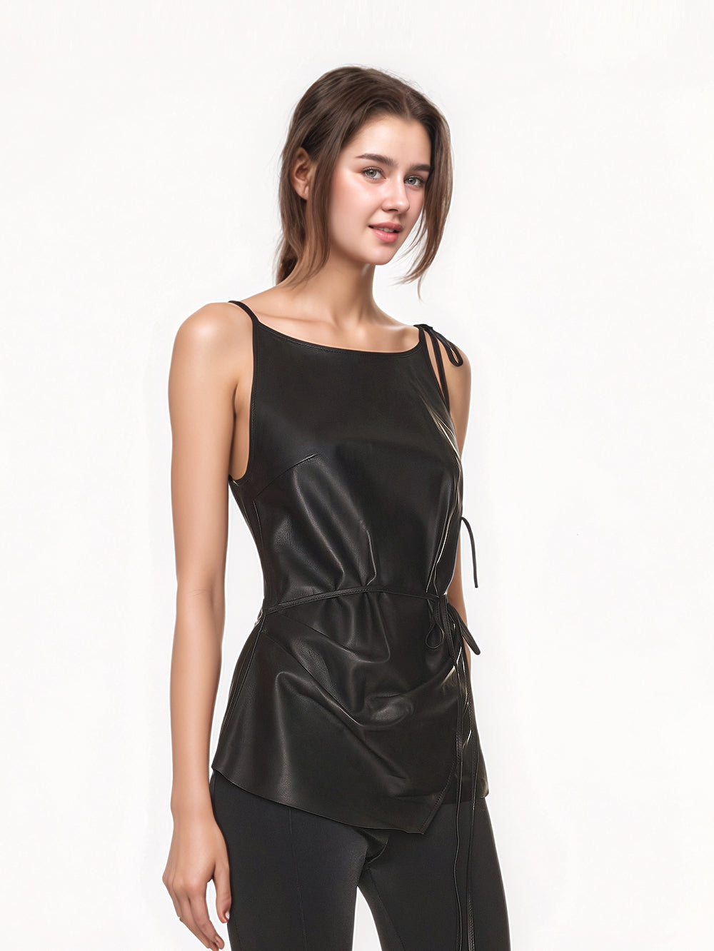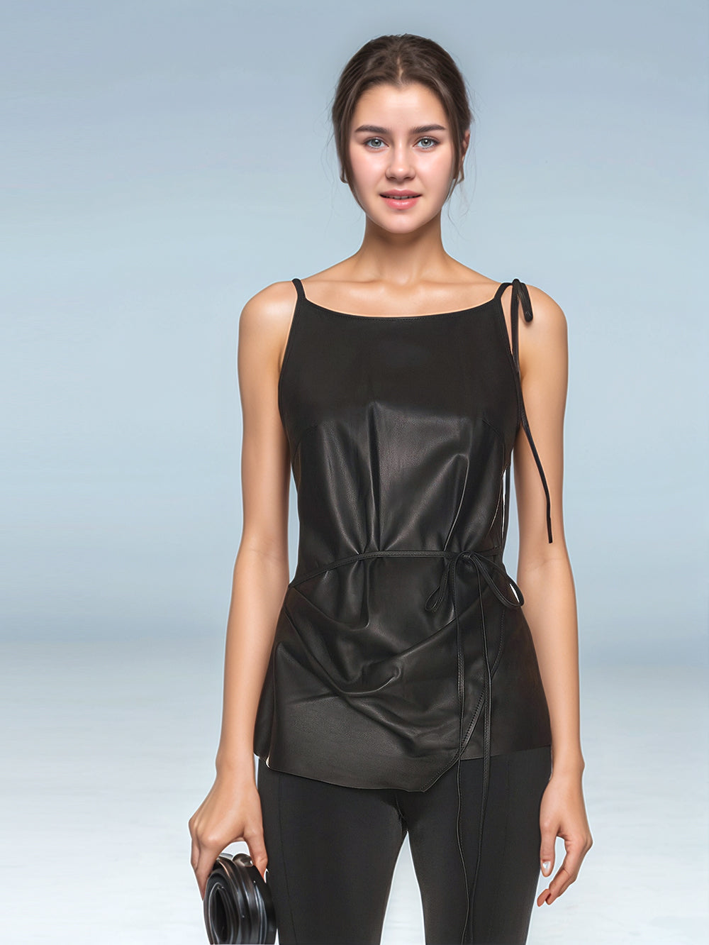 Conçue pour la femme moderne, la blouse sans manches en cuir de luxe Eterna respire la sophistication et le luxe. Confectionnée en cuir de haute qualité, elle offre un look élégant et raffiné. Parfaite pour une journée au bureau ou une soirée, elle apporte une touche d'élégance à toutes vos tenues.